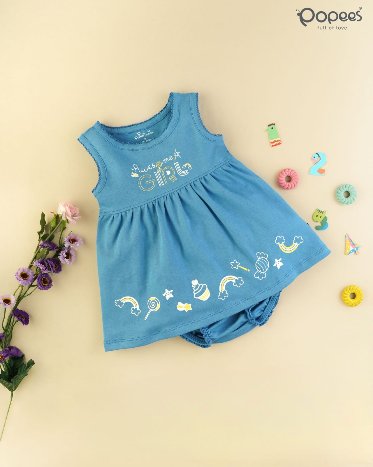 This adorable Sleeveless Dress from Popees Baby Care offers a comfortable and playful outfit for girls aged 3 to 18 months. This single-piece dress features a gathered skirt and a cheerful graphic print with the words and whimsical elements like rainbows and sweets. Crafted from 100% cotton and made in India, this dress provides a soft and gentle feel for everyday wear. The set also includes a separate pair of matching panties.